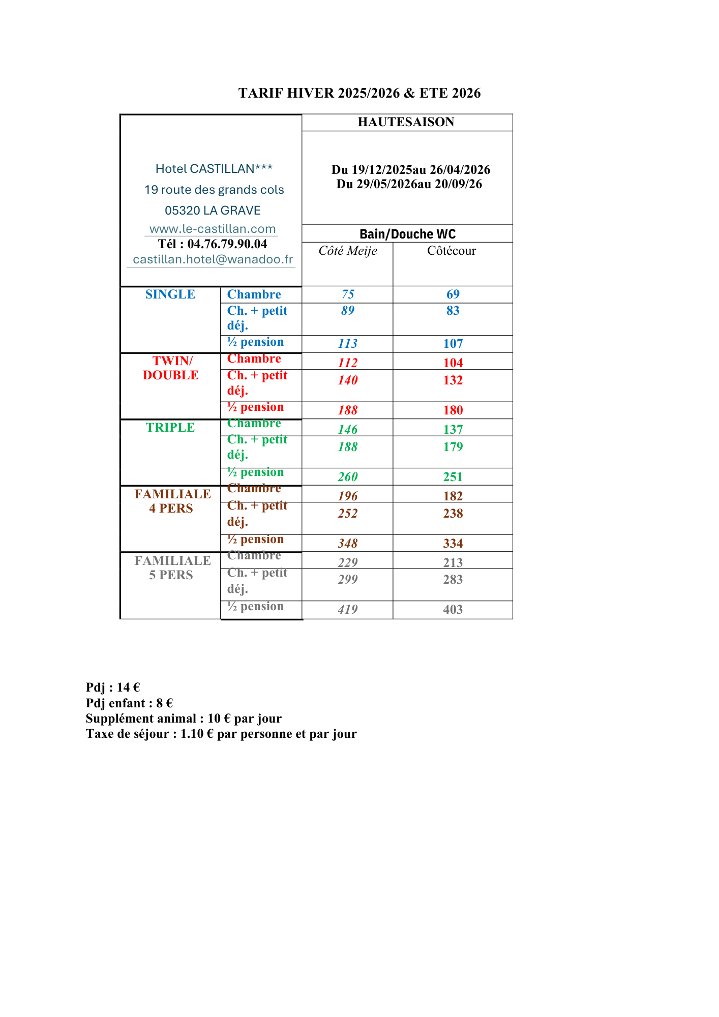 Tarif 2025-2026